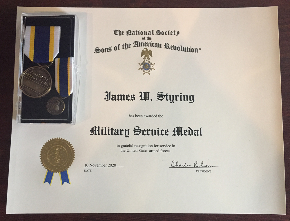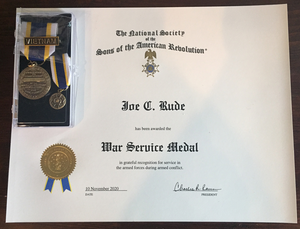 Our Registrar/Genealogist Tom Chrisman received this award this year for his efforts in compiling documentation from applicants and following the submission process to the State and National SAR.