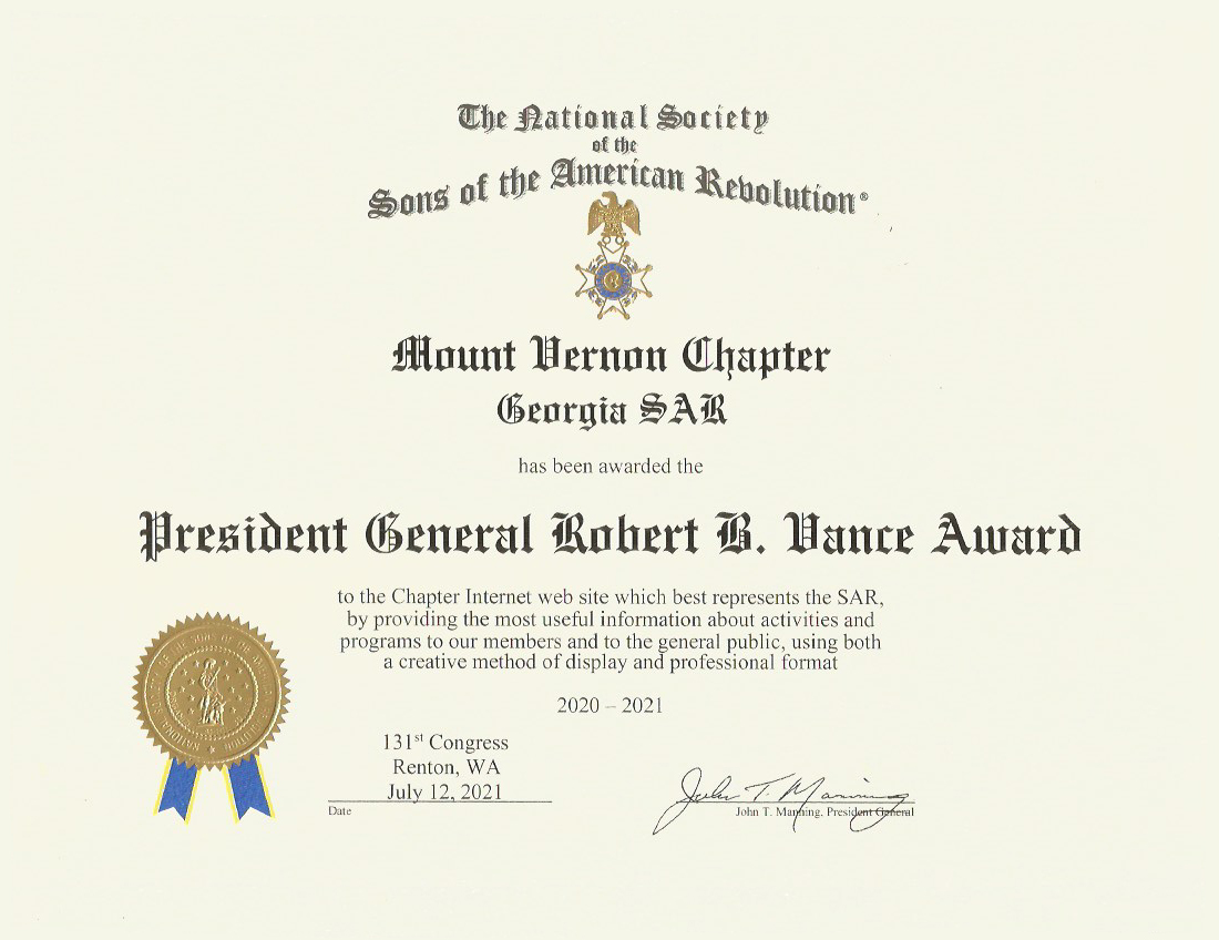 - The next Mount Vernon Meeting is on Tuesday Feb 9th. It will be a Zoom only meeting. 2021 Officers will be inducted by 2021 GA SAR President David Jessel.