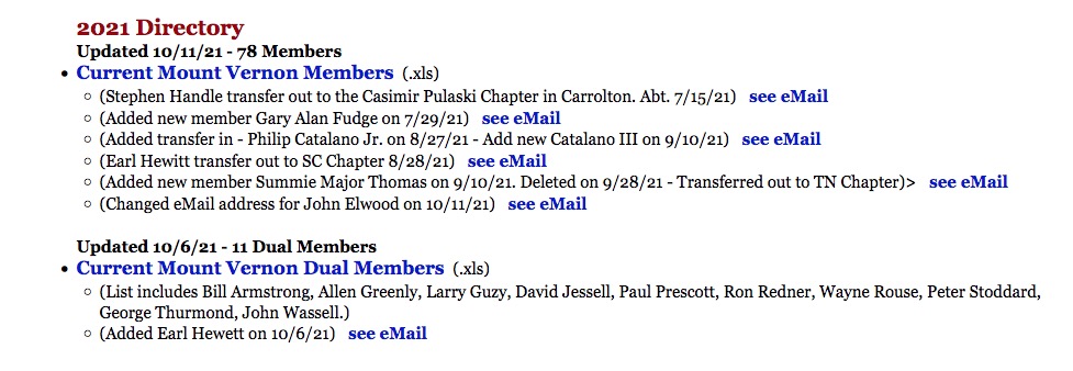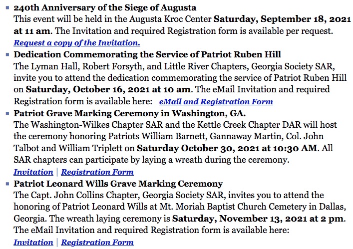 - Dues Renewal: President Tom Pye noted that 25 members have not paid dues as of last week. Shep has been reaching out to these remaining members. In January 2022, members not paying 2022 dues will be dropped from the current SAR National database (by NSSAR) and will be required to submit a reinstatement form and pay a $15 State of Georgia fee.