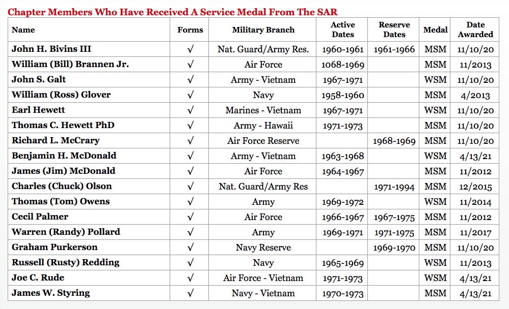 - Chapter Veterans: Shep Hammack reminded everyone that Thursday 11/11 is Veterans Day, and that the Chapter has recognized 17 chapter members who have received an SAR Service Medal. That medal is the second highest medal given by the SAR. Shep put up a visual on the screen and President Pye read the list of the 17 names, followed by a round of applause from those present at the meeting. Note: Sunny Lee and Gene Ray are in the process of submitting their DD-214 forms for their Service Medals.
