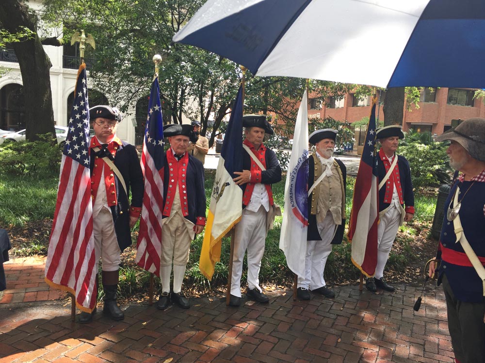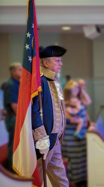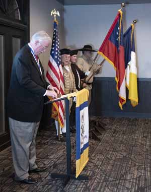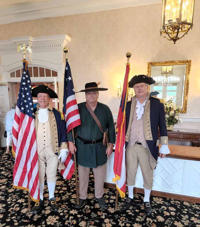 Three compatriots conducted the Presentation of Colors, all were in uniform. Chapter Color Guard Commander Shep Hammack (Washington), Tom Hewett (militia), and Tom Chrisman (militia).