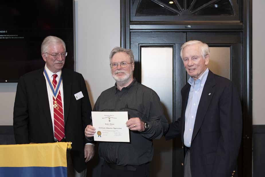 VP McCrary presented guest speaker Robert Jones with a Certificate of Appreciation. President Tom Pye (L), Speaker Robert Jones and VP Richard McCrary (R)