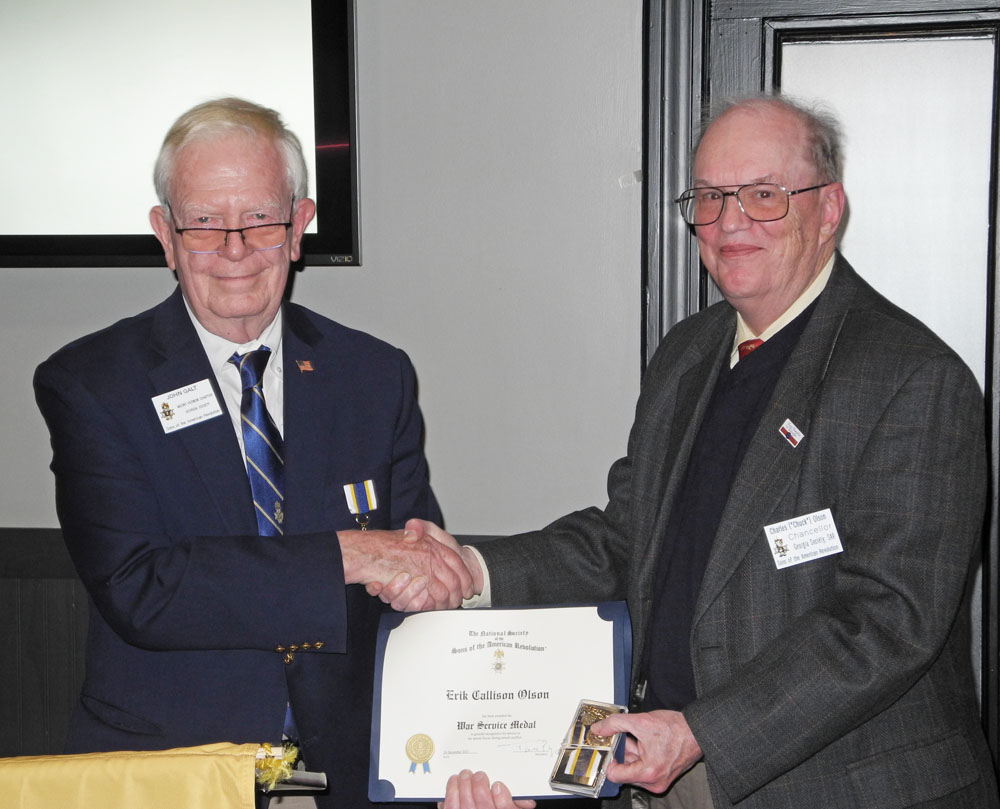 He has received several State and National awards including; Patriot Medal, Gold & Silver Roger Sherman Medals, Liberty Medal with eight Oak Leaf Clusters, Silver Good Citizenship Medal & Silver Color Guard Medal. He has been the First Line Signer for over 80 new members in the Sons of the American Revolution, and is our current Mount Vernon Chapter Historian.