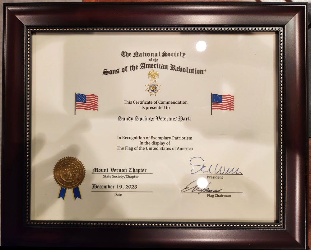 An additional certificate is scheduled for the Sandy Springs Veterans Park Flag and it is possible that will be presented at the same time.